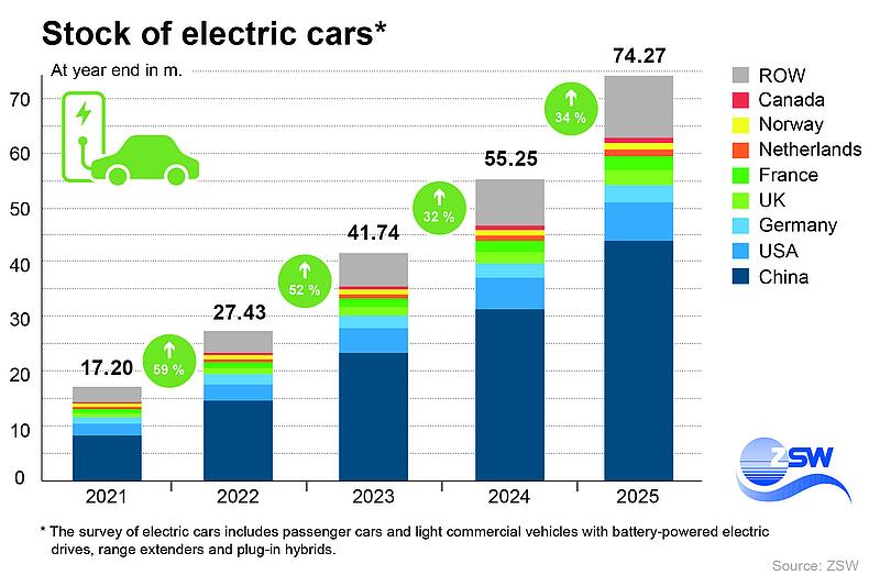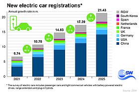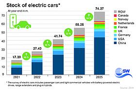 The global electric vehicle market is increasingly dominated by China: Even though almost all markets recorded partially significant growth, China now ac-counts for two thirds of the 21.4 million new registrations, totalling 14.2 million vehicles. Moreover, almost every second newly registered car there is an electric vehicle. Chinese manufacturers dominate the domestic market, while manufacturers from other countries are only represented to a very limited ex-tent. In the USA, however, new registrations were down slightly due to the ex-piry of tax credits for the purchase or leasing of electric vehicles in September 2025. Developments in Europe are encouraging: After stagnating in the previ-ous year, new registrations rose significantly to around three million electric vehicles in 2025. This means that the EU has once again secured second place in the vehicle market behind China. These two markets are also the largest growth drivers for electromobility.