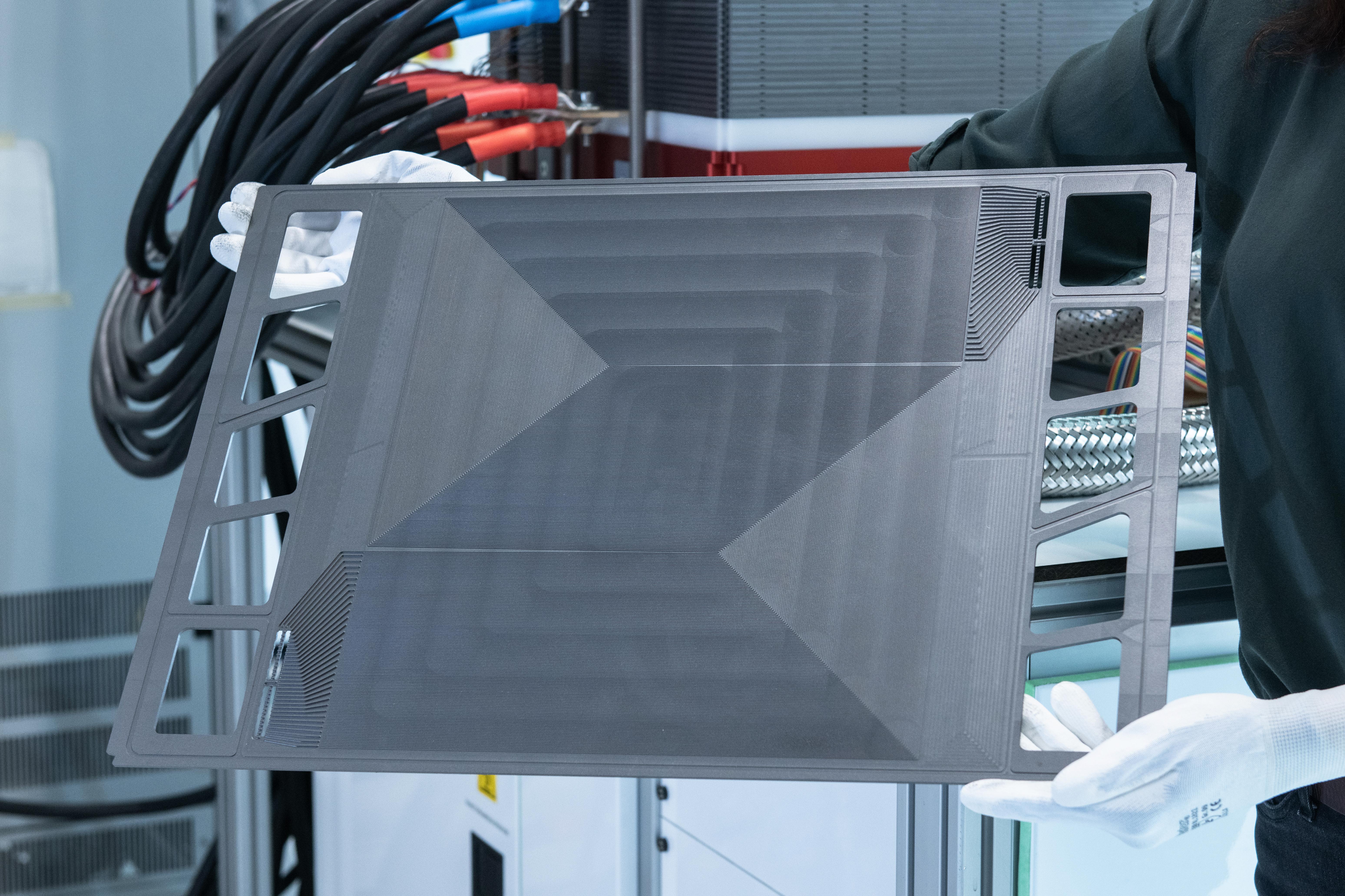 For example, the manufacturer-independent “generic stack” is designed for a maximum power of 150 kilowatts, which requires 500 individual cells, each with two metal bipolar plates. The advantage of metal bipolar plates is that they can be manufactured by forming, which allows high volumes with short cycle times. Here, the challenge lies in the very thin wall thicknesses of only one-tenth of a millimeter at a length of more than 40 centimeters per sheet.