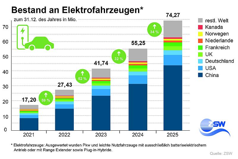 Der weltweite Bestand an Elektroautos beläuft sich Ende 2025 auf 74,3 Millio-nen Fahrzeuge. Rund 60 Prozent bzw. rund 44 Millionen davon sind in China zugelassen, die USA liegen mit 7,1 Millionen Elektro-Pkw auf Platz 2 vor Deutschland mit 3,2 Mio. Fahrzeugen. Die größten Wachstumsraten im Be-stand erzielten mit Ausnahme des chinesischen Markts (+40 Prozent) vor allem kleinere Märkte wie Spanien mit 50 Prozent (+232.200 Fahrzeuge) und Dänemark mit 42 Prozent (+206.600 Fahrzeuge).