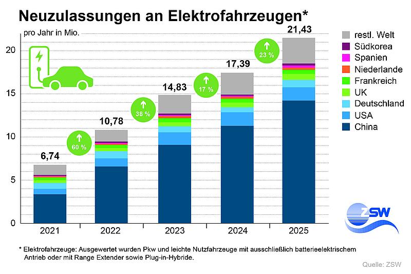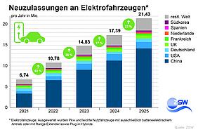 Der globale Elektrofahrzeugmarkt wird dabei immer stärker von China beherrscht: Auch wenn in fast allen Märkten ein teilweise deutliches Wachstum zu verzeichnen ist, entfallen von 21,4 Millionen Neuzulassungen nunmehr zwei Drittel bzw. 14,2 Millionen Fahrzeuge auf China. Dort ist zudem fast jeder zweite neu zugelassene Pkw ein Elektrofahrzeug. Dabei dominieren chinesische Hersteller den Heimatmarkt und Hersteller anderer Länder sind nur in sehr geringem Umfang vertreten. In den USA nahmen die Neuzulassungen aufgrund im September 2025 ausgelaufener Steuergutschriften für den Kauf oder das Leasing von Elektrofahrzeugen hingegen etwas ab. Erfreulich ist die Entwicklung in Europa: Nach einer Stagnation im Vorjahr stiegen die Neuzu-lassungen 2025 deutlich auf rund drei Millionen Elektrofahrzeuge an. Damit sichert sich die EU erneut den zweiten Rang im Fahrzeugmarkt hinter China. Diese beiden Märkte stellen zugleich die größten Wachstumstreiber für die Elektromobilität dar.