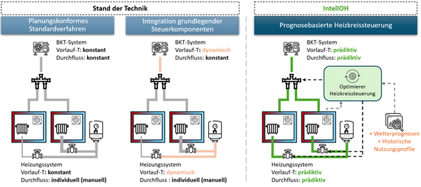 Die folgende Abbildung (Abb.1) illustriert links den aktuellen Stand der Technik: ein planungskonformes Standardverfahren, bei dem die Grundlastabdeckung über eine konstante Vorlauftemperatur der Betonkerntemperierung (BKT) und der Heizkörperbetrieb über thermostatische Einzelraumregelung erfolgt. Eine weiterentwickelte Variante berücksichtigt bereits grundlegende Steuerungskomponenten und ermöglicht eine homogene, dynamische Regelung der Vorlauftemperaturen für BKT und Heizkörper – allerdings meist nur eingeschränkt und ohne vollautomatisierte Optimierung.